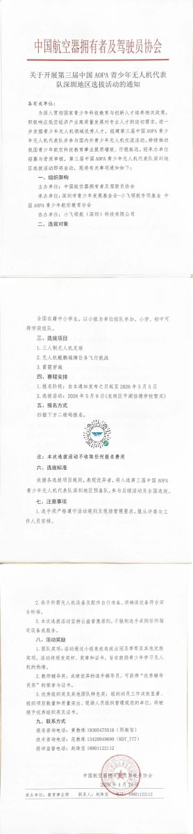 关于开展第三届中国AOPA青少年无人机代表队深圳地区选拔活动的通知